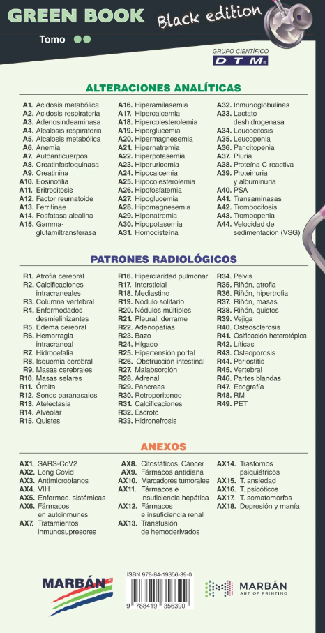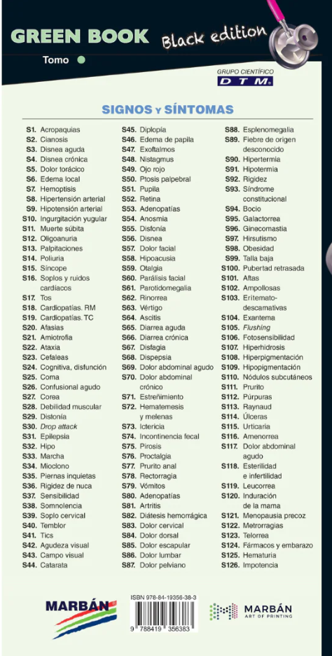 GREEN BOOK es el libro de Diagnóstico y Tratamiento en Medicina Interna, en el que el “signo” es la forma de entrada a la información. Por ejemplo: desde el signo y síntoma “hipotensión arterial” se presentan los diagnósticos diferenciales con sus tratamientos en patologías específicas como “hipotensión ortostática, shock hipovolémico, shock cardiogénico, shock obstructivo…” (¡¡visualiza el capítulo de muestra para comprobarlo!!).